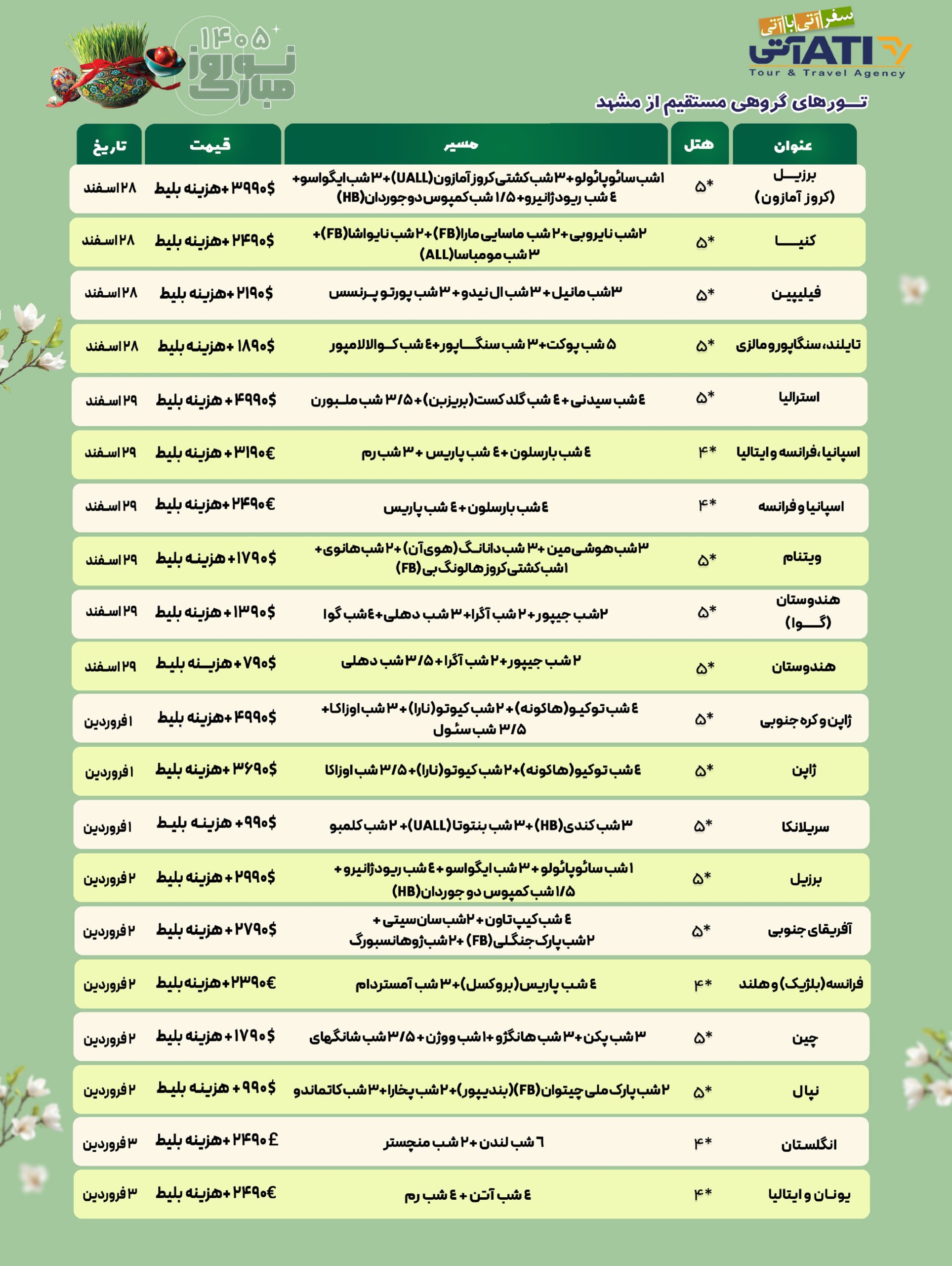Ati Tour and Travel Agency, with over 33 years of experience, is the only representative of Lufthansa City Center in the east of Iran, holding a high rank among members in more than 110 countries for 20 years. With more than 190 full-time employees, the company operates from offices in Mashhad and Tehran and represents major airlines such as Iran Air, Mahan, Emirates, Qatar Airways, Turkish Airlines, Flynas, Pegasus, and others ATI Tour and Travel Agency provides extensive services including online and in-person booking of domestic and international flights, train tickets, and inbound/outbound tours. Customers can make bookings through dedicated websites and also benefit from hotel reservations (3 to 5 stars), transportation services, and city tours across Mashhad and other cities in Iran. The agency also officially handles visa services for countries such as India, Schengen countries, Canada, the United States, and more. Additional achievements of Ati Tour and Travel Agency include official certifications from aviation and tourism authorities, membership in professional tourism associations, issuing international driving licenses, participation in major international fairs, and receiving numerous sales awards from major airlines. Ati also holds a medical tourism license and cooperates with reputable hospitals and medical centers. read moreAti Tour & Travel Agency